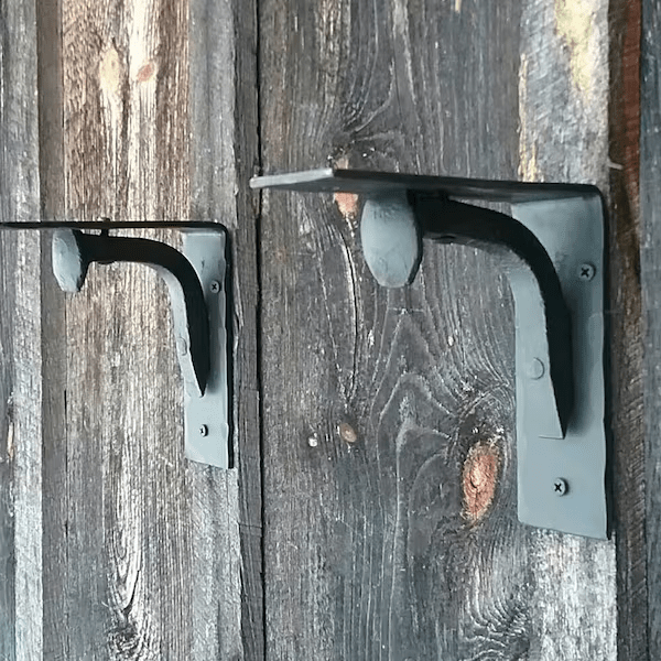 - A hand-forged iron bracket holding up a pine shelf